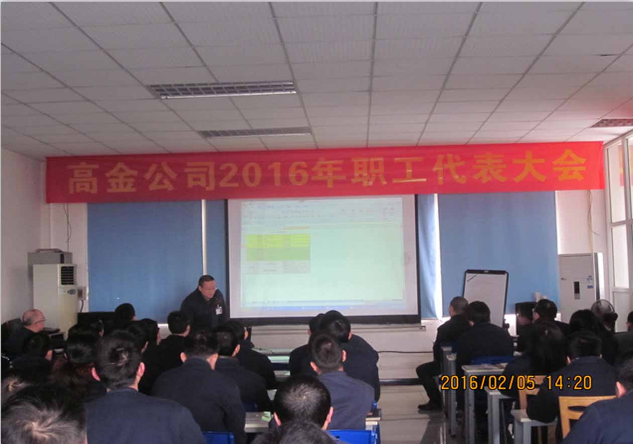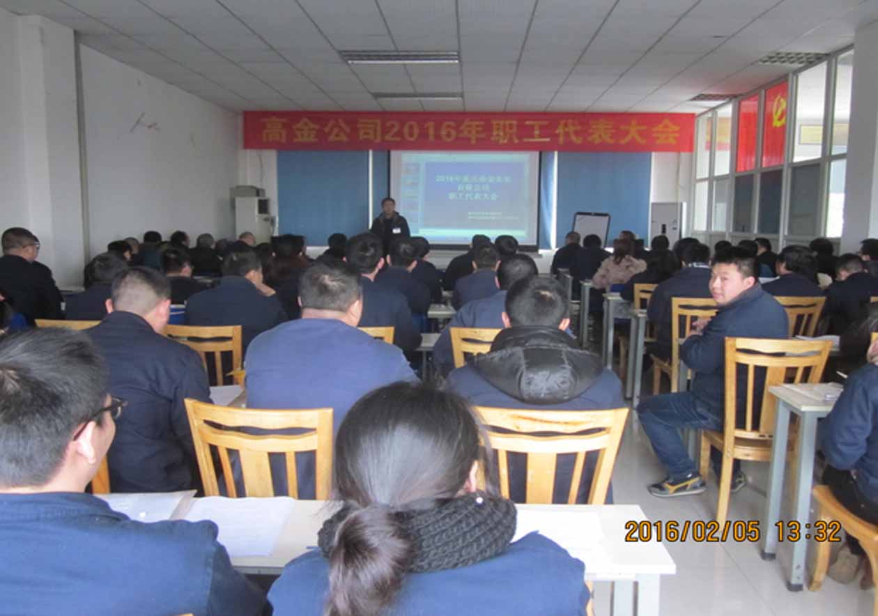 2016年2月5日,重慶高金實業有限公司2016年第一次職工代表大會在二樓培訓室隆重召開,公司黨支部書記兼常務副總經理易小波、生產副總許鋒、總經理助理劉天全、財務部部長敬國仁、工會主席曹興建及公司各部門負責人和職工代表共75人出席了大會。
